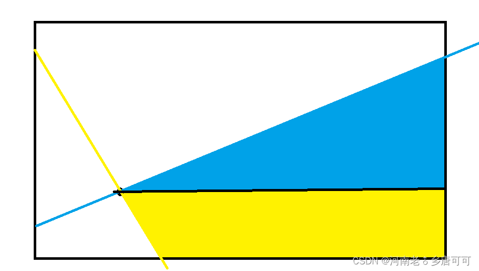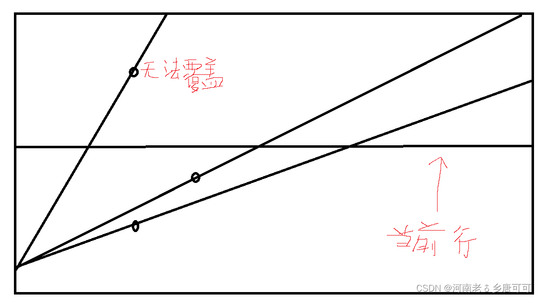 题目大意 二维平面,屏幕是 $(0, 1)–(0, m)$ 的线段,有$n$行$m$列座位在屏幕前面,是坐标范围 $1 ≤ x ≤ n, 1 ≤ y ≤ m $的整点。有$k$个座位已经有人,求出到屏幕的视线不被任何人挡住的座位数量。题目链接 一个人挡住的区域是它与屏幕两端连线所形成的夹角区域。 可见视线遮挡是被两条线段确定的,但是实际上,单条连线也能够确定视线遮挡的范围。 对于一条线,水平向右的直线和它自身形成的夹角,是一定被视线遮挡的,而两条线确定的,刚好就是这两个相邻区域的并集。对于当前行,能够覆盖该行的,通过左下角的线,一定是在该行以下,而此时显然斜率越大的线,覆盖的越多。 所以我们逐行处理的时候,保存斜率最大的直线。